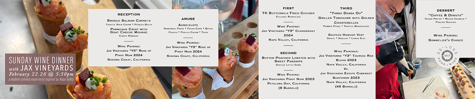 Join us for a memorable evening where modern Napa meets culinary history here in North Pasadena.We are proud to pour the wines of JAX Vineyards, a producer known for their focus on “setting the agenda for modern Napa Valley” through the dynamic vision of siblings Trent and Kimberly Jackson. To match the pedigree of JAX’s wines, we present a 5-course pre-set homage to the renowned Chef Thomas Keller. Inspired by his “pursuit of perfection” defined in “The French Laundry Cookbook”, our unique vision for the evening’s menu celebrates the legacy of Keller’s acclaimed restaurants The French Laundry, Ad Hoc and Per Se, translating their elevated standards into an intimate and one-of-a-kind dining experience within our own charming art-filled space.Tickets are available for $145 +tax and gratuity.